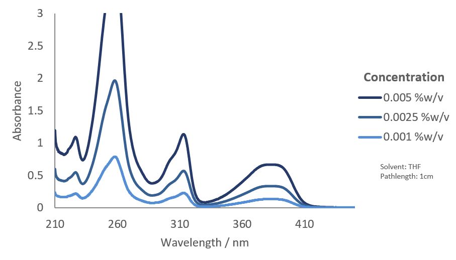 | Maxima Absorption Wavelength (nm) | 257, 312, 383 |