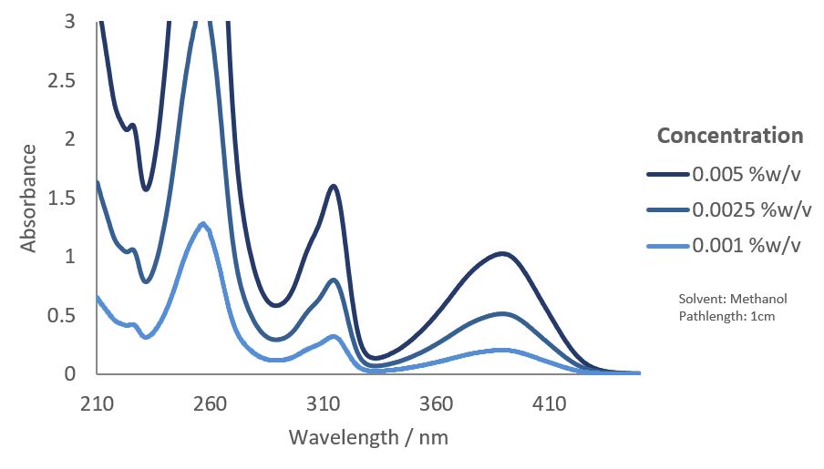 | Maxima Absorption Wavelength (nm) | 257, 314, 389 |